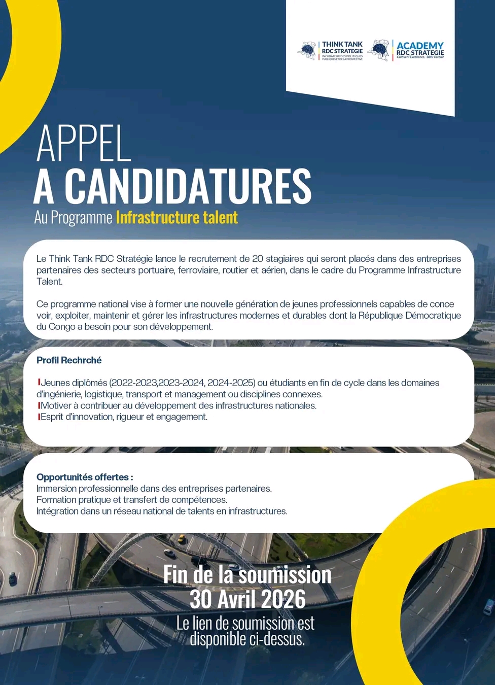 Dans le cadre du lancement officiel du programme Infrastructure Talent, le Think Tank RDC Stratégie lance un appel à candidatures pour le recrutement de 20 stagiaires. Ces derniers seront intégrés au sein d’entreprises partenaires opérant dans les secteurs portuaire, ferroviaire, routier et aérien.