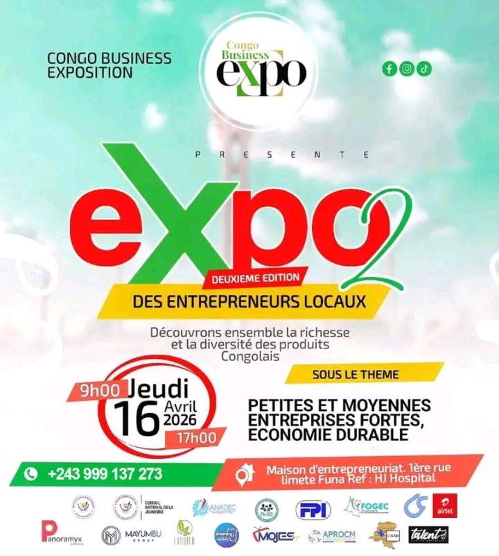 La deuxième édition du Congo Business Expo se tiendra le jeudi 16 avril 2026 à partir de 9h00, à la Maison de l’Entrepreneuriat, située dans la commune de Limete à Kinshasa. Placé sous le thème « Petites et Moyennes Entreprises fortes, économie durable », cet événement ambitionne de mettre en lumière le potentiel des entrepreneurs locaux et de promouvoir la richesse ainsi que la diversité des produits congolais.