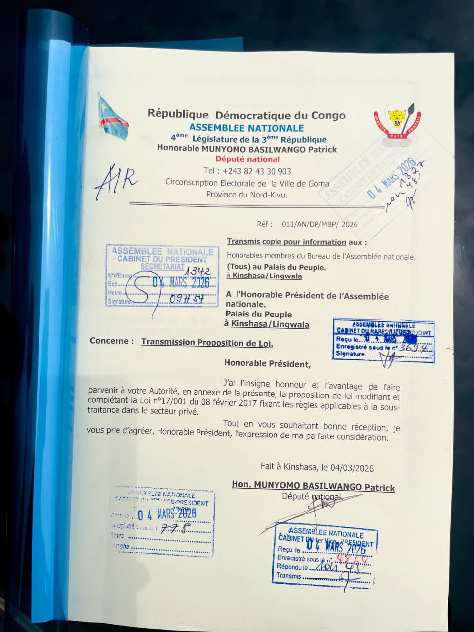 Le député national Patrick Munyomo a franchi une étape clé pour l’économie congolaise en déposant officiellement une proposition de loi sur la sous-traitance à l’Assemblée nationale. L’objectif : renforcer la participation des entreprises locales et stimuler la création d’emplois pour les jeunes Congolais.